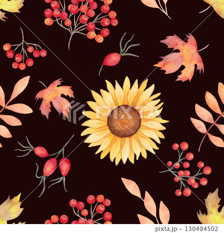 A seamless pattern with berries, mushrooms, and flowers for Thanksgiving. Watercolor illustration. Hand drawn isolated botanical art. Background with sunflowers, rose hips, rowan berries maple.