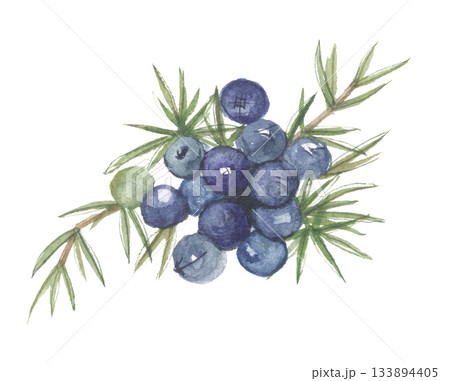 水彩で描かれた、松の葉とブルーベリーのボタニカルパターン
