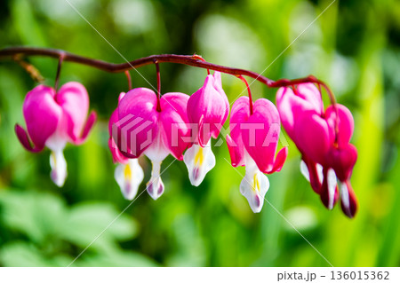 一列に並んだハート形の薄ピンクのタイツリソウの花 ロンドン郊外のイーストコート・ハウス・ガーデンにて