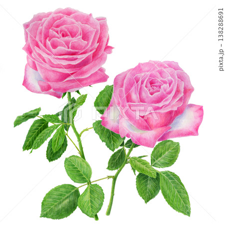 水彩風 ピンクのバラ素材セット 花・葉・茎付きのフラワーパーツイラスト