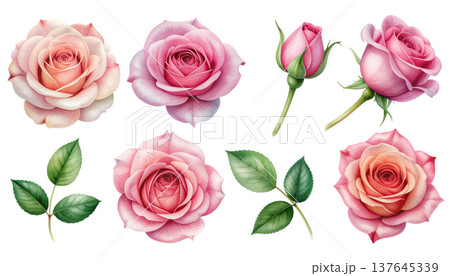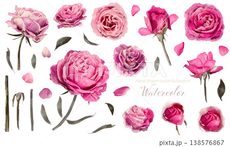 水彩で描いた美しいピンクのバラのベクターイラスト素材セット