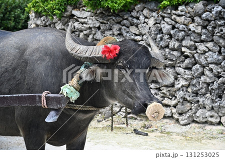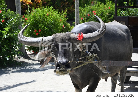 竹富島 ハイビスカスのリボンをつけた水牛