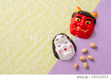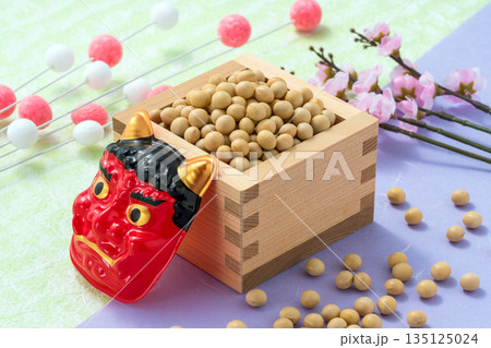 た福豆入りの枡と赤鬼のお面 節分イメージ素材