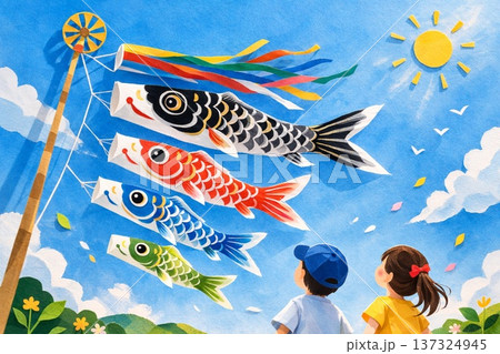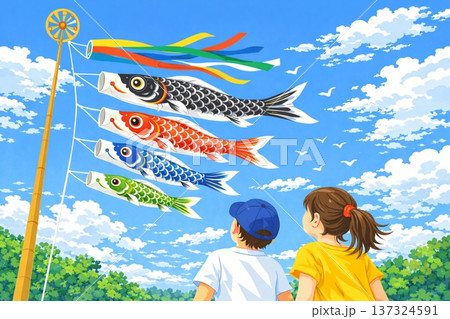 こどもの日 こいのぼり 青空 子どもたち ベクター