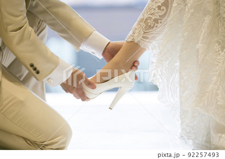新郎新婦が靴を履かせてあげるシチュエーションのブライダル写真