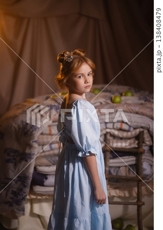 Little girl in blue dress sitting on stacked mattresses with apples, princess concept, studio drapery