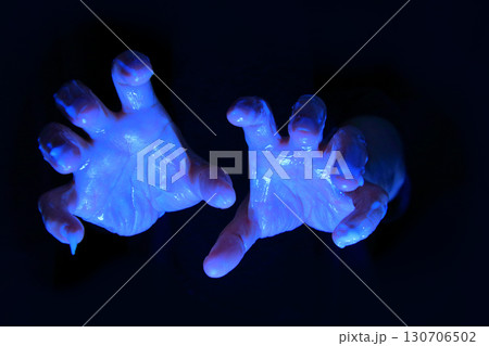 Zombie hands with wounds and blood reaching out of the grave ground with a dark background. Zombie, devil, evil, satan, or monster hand. Dramatic smoke or fog effect. Concept of Spooky Halloween