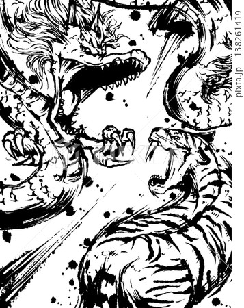 金色の塵で描かれた虎・龍・大蛇の躍動、漆黒の背景に映える水墨画風背景素材
