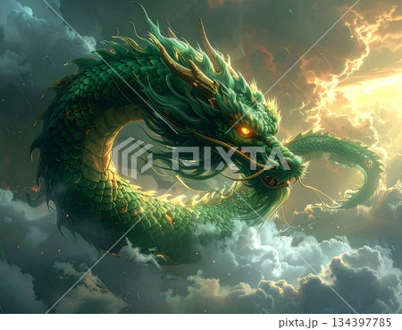 和風の背景を円形に泳ぐ緑龍