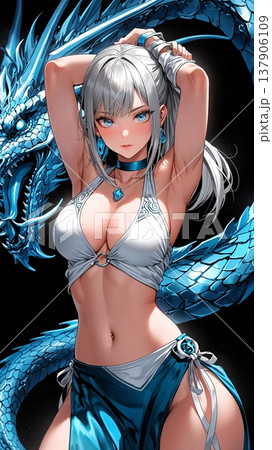 美しい女性とドレス、背後に巨大な龍が佇む幻想的な姿