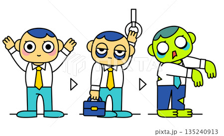 通勤によって精神を消耗しゾンビ化していく会社員の変化を表現したイラスト