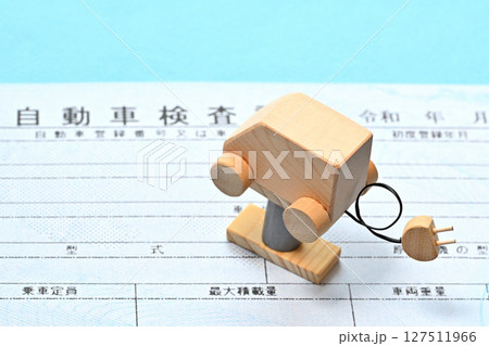 電子車検証とリフトに載せられた電気自動車のイメージ