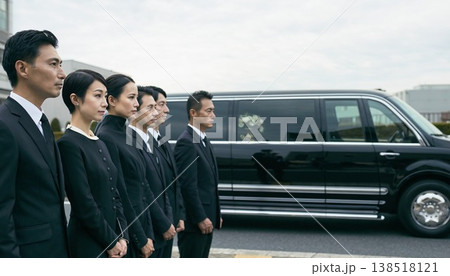 葬儀の送り出し:喪服姿で整列する遺族と黒のリムジン
