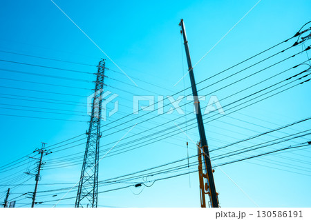 空に伸びるクレーンのアームと送電鉄塔 a-4 ライトカラー