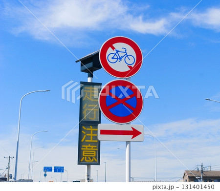 東京都市風景 歩行者用通路に設置された「自転車乗り入れ禁止」の看板