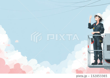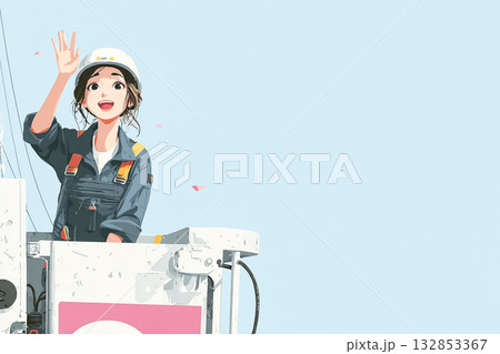 美優シリーズ:高所作業車のバケットで笑顔で手を振る女性技術者