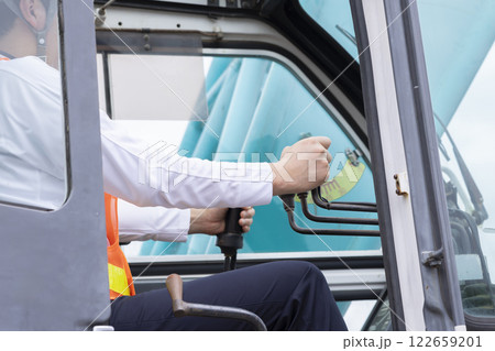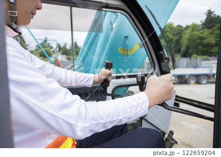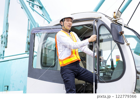 クレーン車の運転手 タブレットを見ながら作業内容を確認する男性