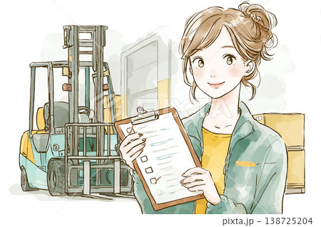 絵美シリーズ:フォークリフトが並ぶ物流現場に立つ若い女性のイラスト素材