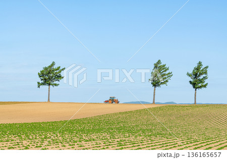 北海道女満別 人気の観光スポット 夏のメルヘンの丘と作業中のトラクター