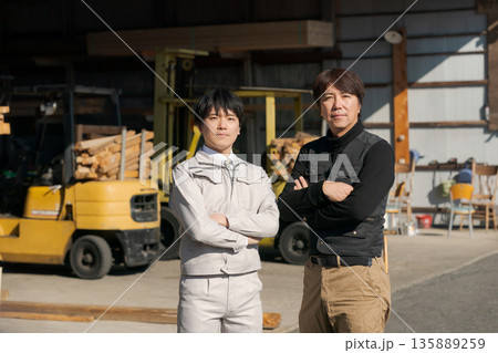 フォークリフトで木材を運ぶ作業員 腕組のカメラ目線