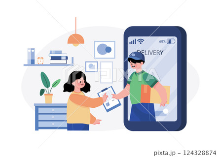 A young woman receiving parcel from delivery service courier through smart phone screen