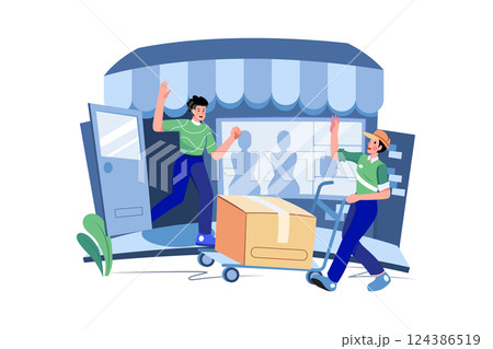Delivery man pushes the hand truck trolley full of cardboard boxes hands package to a customer.