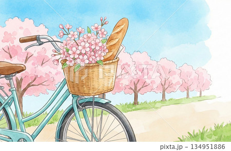 桜シリーズ:自転車のカゴいっぱいの桜とフランスパンの春の風景