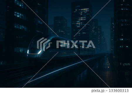 Futuristic magnetic monorail train with sleek design moving through a high-tech urban environment