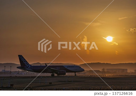 夕暮れの仙台空港 夕日とタキシング中の飛行機 宮城県名取市
