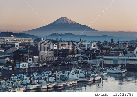 静岡県静岡市にある用宗漁港の見た冬の早朝の富士山