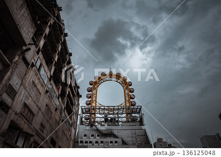 曇天に浮かぶ観覧車と老朽化した都市建築