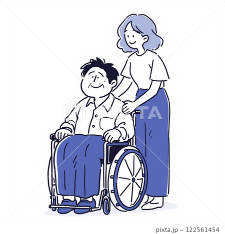 車椅子を押す男性の後ろ姿、線画