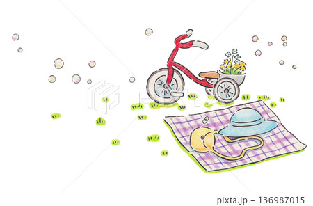 春の野原 三輪車とシャボン玉のイラスト