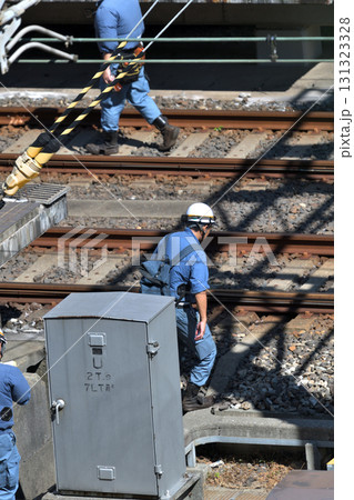 線路の保守・点検作業風景 線路を歩いてレールの歪みや傷つきを目視で確認