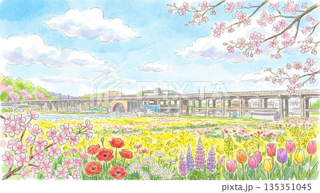 夕暮れの電車内に佇むアニメ美少女 桜舞う春の通学風景イラスト