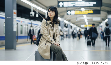 駅のホームでスーツケースを持ち旅行や出張に向かう女性のイラスト