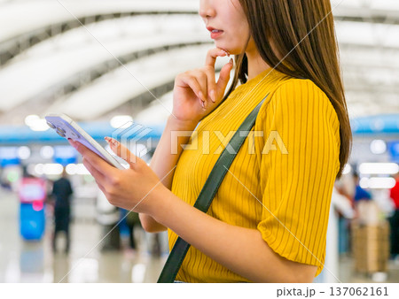 駅でスマホ操作する女性 ■撮影協力:関西国際空港(KIX)