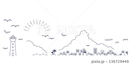 手描きのイラストテンプレートセット_海と建物と灯台_1