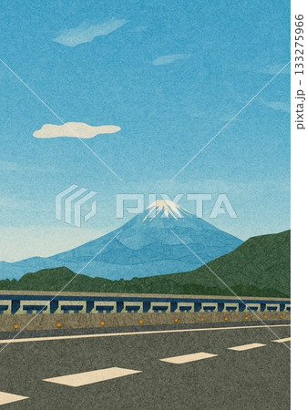 高速道路から望む富士山の風景・晴天の青空が広がるコラージュ風イラスト