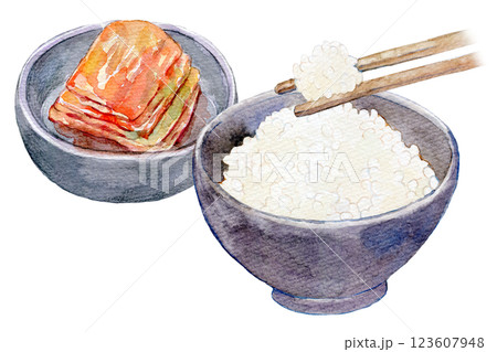 水彩イラスト 白いご飯とキムチのセット