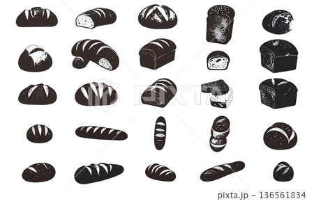 Collection of delicious freshly baked bread loaves and slices in a handdrawn sketch style