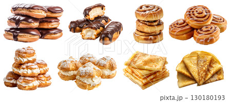 Collection of 4 set group pile of cake bread pastry dessert., Chocolate Eclairs, Cinnamon Roll, Crepe, Cream Puff on transparent background cutout PNG file. Mockup template for artwork design