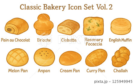 ベーカリーアイコンセット Vol.2 手描きパン素材(カフェ風・透明背景)