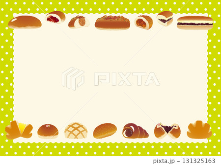 パンのフレーム_懐かしいパン勢揃い_水玉テーブルクロスとランチマット_横位置黄緑色