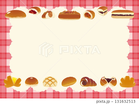 パンのフレーム_懐かしいパン勢揃い_チェック柄のテーブルクロスとランチマット_横位置赤とピンク