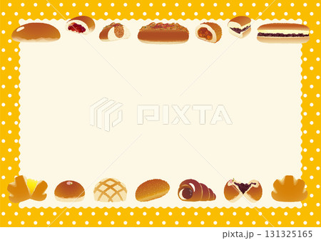 パンのフレーム_懐かしいパン勢揃い_水玉テーブルクロスとランチマット_横位置黄橙色