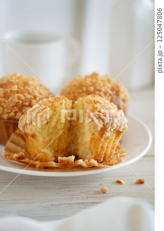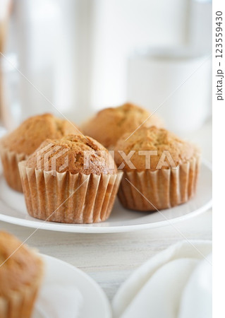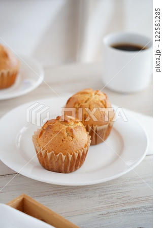 ガラスの皿に盛り付けたマフィンとレモンケーキ