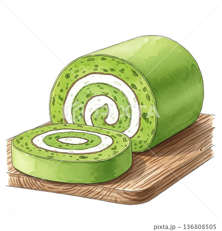水彩で描いた抹茶ロールケーキのイラスト