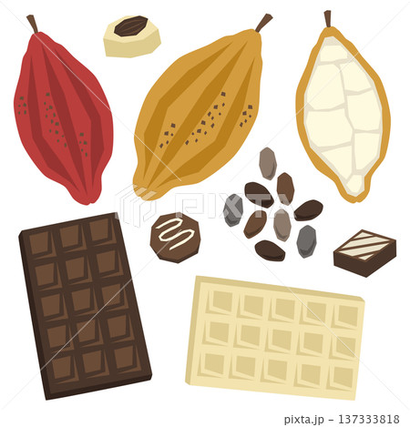 カカオの実 カカオ豆 カカオの断面 加工品のチョコレートなどのベクターイラストセット リノカット風