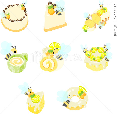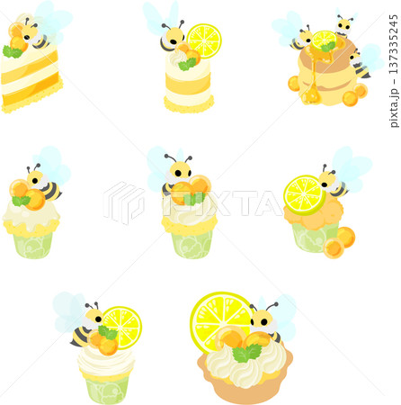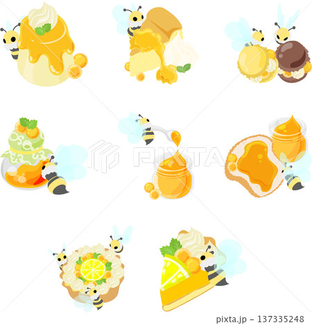 まんまる蜂蜜ゼリーと、マシュマロのミツバチを飾った甘〜いスイーツのイラストセットです。